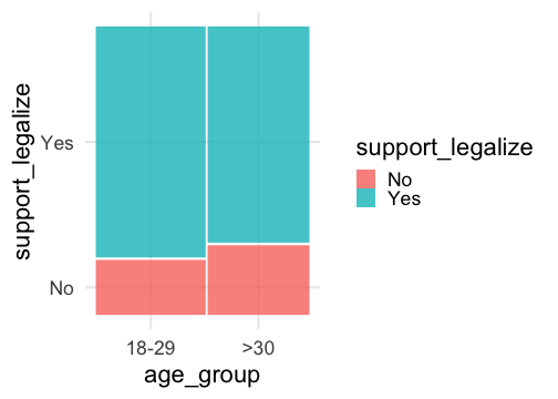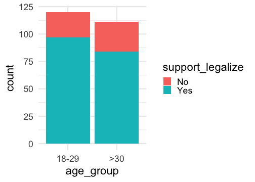 ## # A tibble: 6 × 2## support_legalize age_group## <chr> <fct> ## 1 Yes >30 ## 2 No 18-29 ## 3 Yes >30 ## 4 Yes >30 ## 5 Yes >30 ## 6 Yes 18-29
