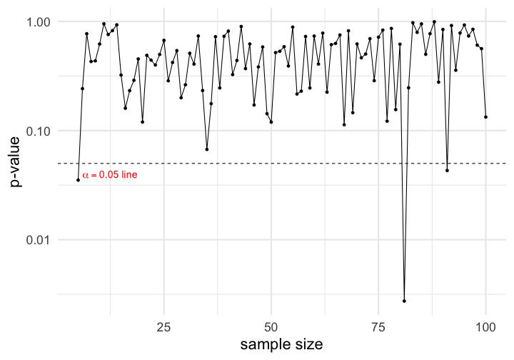 You will see that as long as we keep increasing the sample size, we will eventually reject a null hypothesis we know to be true.